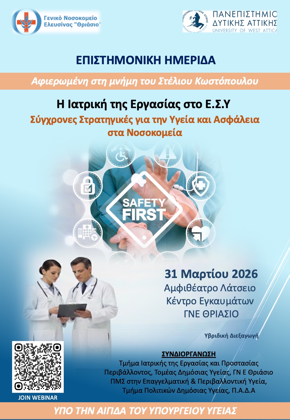 31η Μαρτίου 2026 ΔΕΛΤΙΟ ΤΥΠΟΥ Η Διοίκηση του ΓΝΕ «ΘΡΙΑΣΙΟ» ανακοινώνει τη διεξαγωγή Επιστημονικής Ημερίδας με τίτλο: «Η Ιατρική της Εργασίας στο Ε.Σ.Υ.: Σύγχρονες Στρατηγικές