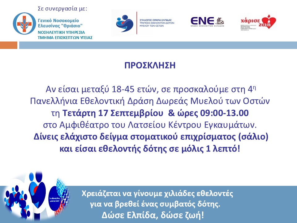 Το «Θριάσιο» Νοσοκομείο συμμετέχει στην 4η Πανελλήνια εθελοντική δράση δωρεάς μυελού των οστών που διοργανώνει η Ένωση Νοσηλευτών Ελλάδος σε συνεργασία με το Σύλλογο «Όραμα Ελπίδας»